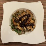 quinoa, snap peas, and / chicken thighs featuring some / Dark Heart Chili Sauce – #StayHome #KissTheCook
