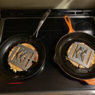 quesadillas with / eggs, bacon, & cheese: weighed down / getting their sear on! – #BreakfastForDinner #StayHome #TheChefsPress
