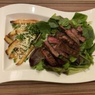 skirt steak salad and / garlic fries. the parsley and / shredded cheese? awesome. – #StayHome #KissTheCook #NotRightAway