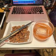 mezcal old fashioned / and almonds before prepping / class materials – #OnTheJob #Training #OffTheClock #Drinking #StayHome