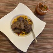 bloody mary spiced / tri-tip and roast corn paired with / a bloody mary! – #OfCourse #StayHome #Cheers