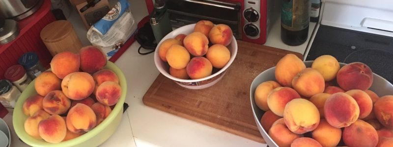roughly eighteen pounds / of peaches from the “orchard” / in front of our house – #OneTreeHarvest