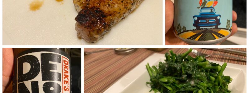his and hers beers and / pork chops with chimichurri, / chrysanthemum greens – #CanThisMarriageBeSaved #Cheers #StayHome #YesWeHadAlmostTheSameMealMonday
