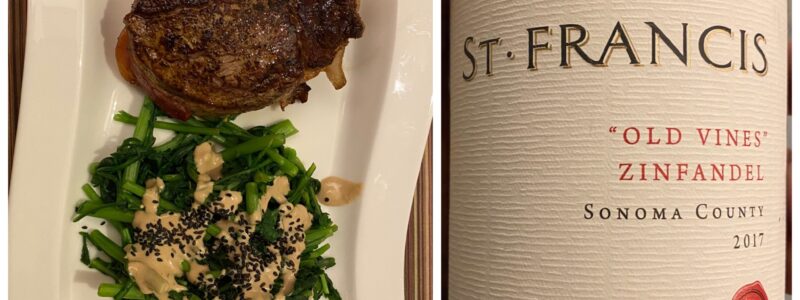 bacon wrapped filet, / chrysanthemum greens, and some / old vine zinfandel. – #Also #SesameDressing #Cheers #StayHome
