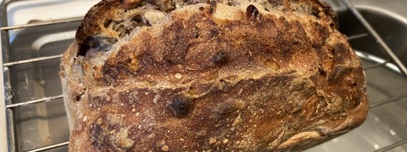 baked a sourdough loaf / with 20% (bakers) / of walnuts. Nutty! – #StayHome
