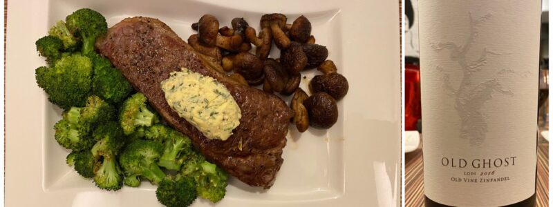 mushrooms, broccoli, / new york strip, herbed butter, and / old vine zinfandel – #Cheers